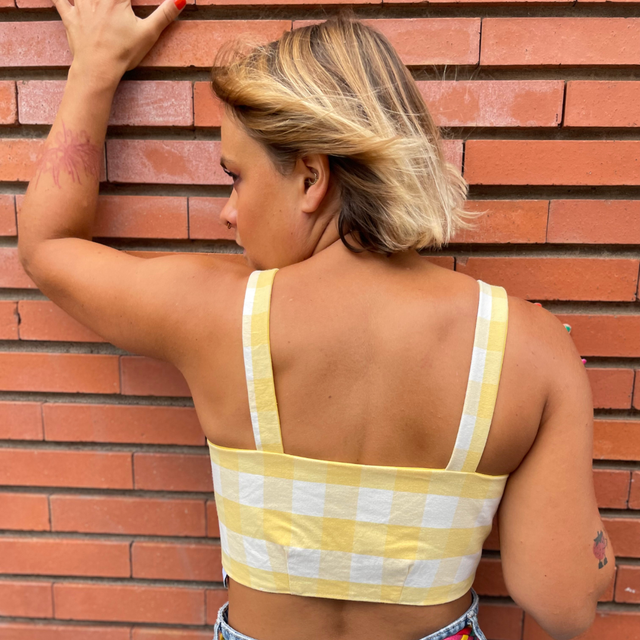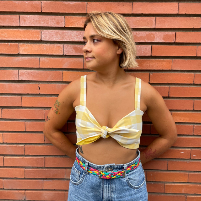 Crop top collection Papillon reversible 2-en-1 en tissu upcyclé.