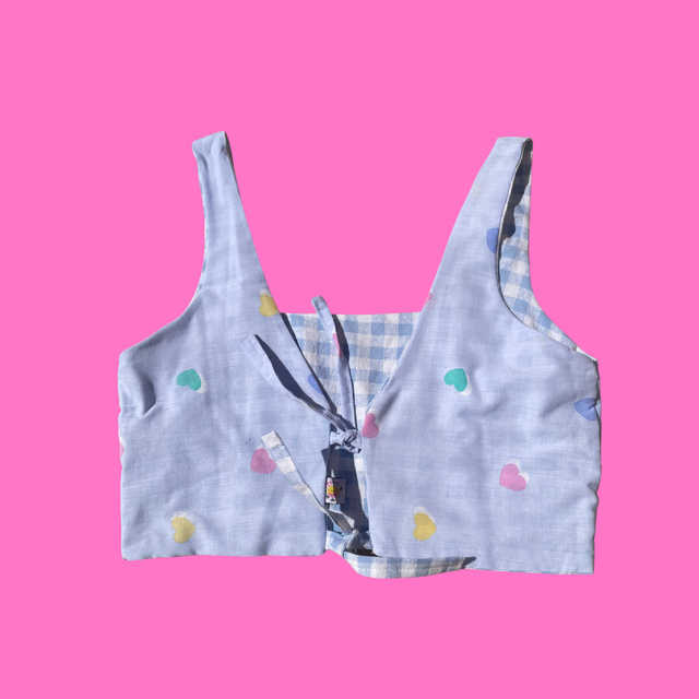 Crop top reversible 2 en 1 en tissu upcyclé.