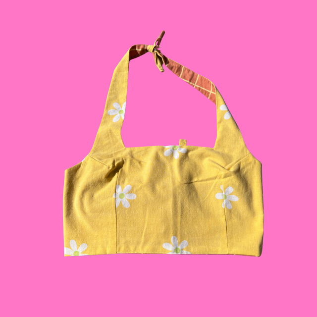 Crop top collection marylin reversible 2-en-1 en tissu upcyclé.