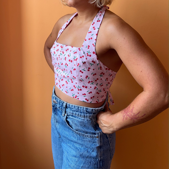 Crop top collection marylin reversible 2-en-1 en tissu upcyclé.