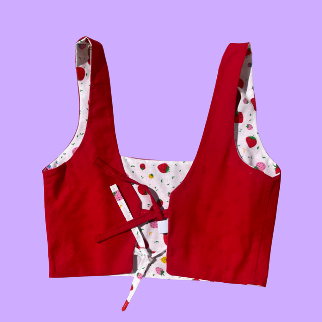 Crop top reversible 2 en 1 en tissu upcyclé.