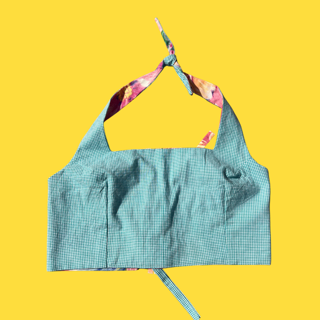 Crop top collection marylin reversible 2-en-1 en tissu upcyclé.