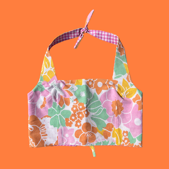 Crop top collection marylin reversible 2-en-1 en tissu upcyclé.