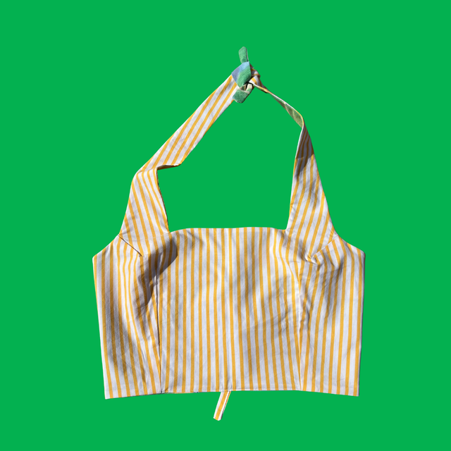 Crop top collection marylin reversible 2-en-1 en tissu upcyclé.