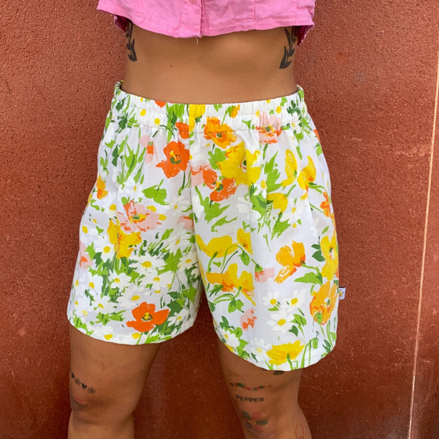 Short en tissu upcyclé, confortable, avec une taille élastique.