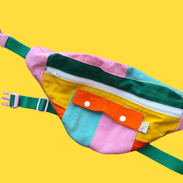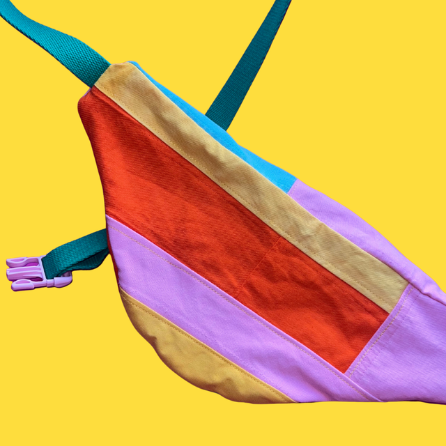 Sac banane 100% upcyclé à partir de bout de vestes en jean colorées.