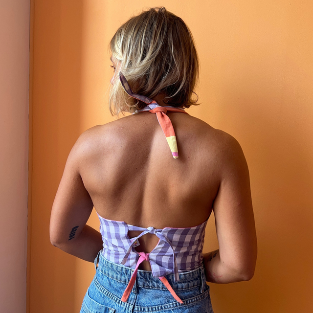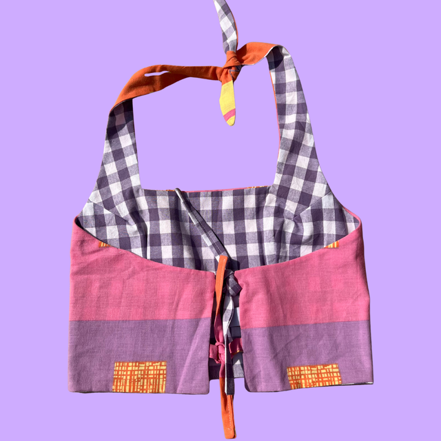 Crop top collection marylin reversible 2-en-1 en tissu upcyclé.