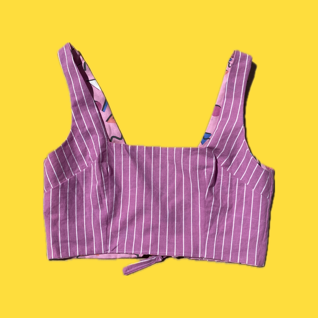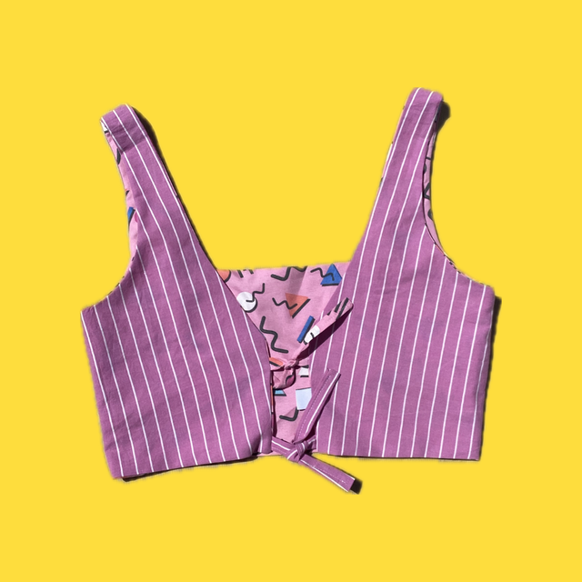 Crop top reversible 2 en 1 en tissu upcyclé.