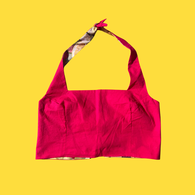 Crop top collection marylin reversible 2-en-1 en tissu upcyclé.