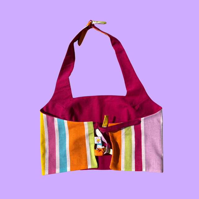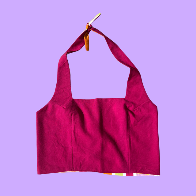 Crop top collection marylin reversible 2-en-1 en tissu upcyclé.