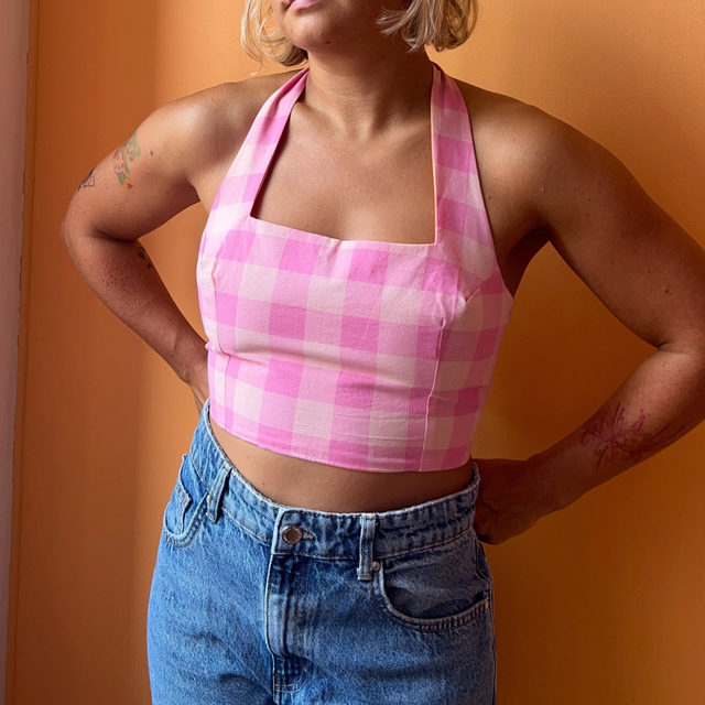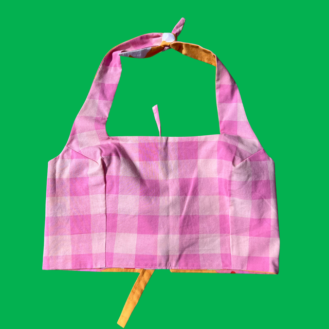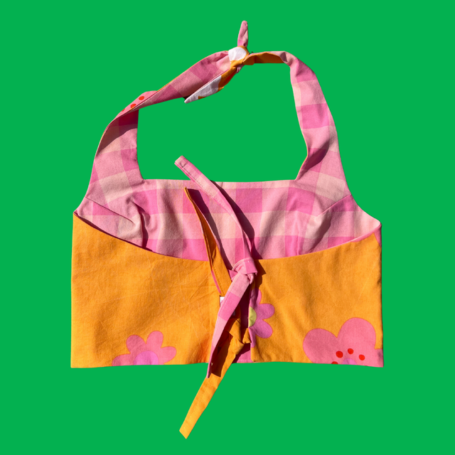 Crop top collection marylin reversible 2-en-1 en tissu upcyclé.