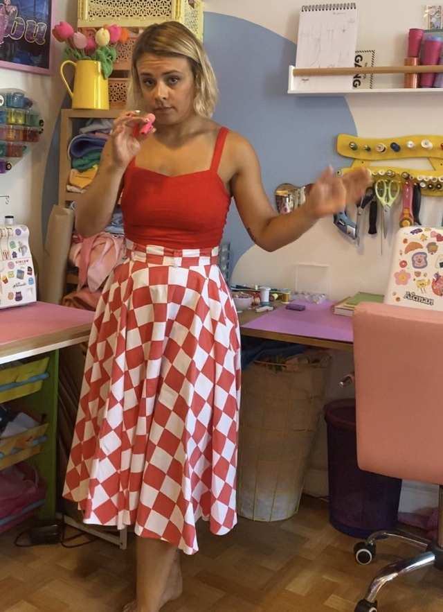 Cette jupe a été confectionnée à partir d'une nappe en coton vintage.