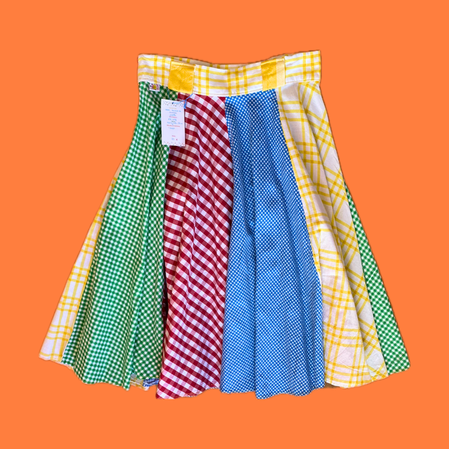 Cette jupe a été confectionnée à partir de différents draps ou chutes de tissu vichy en coton.